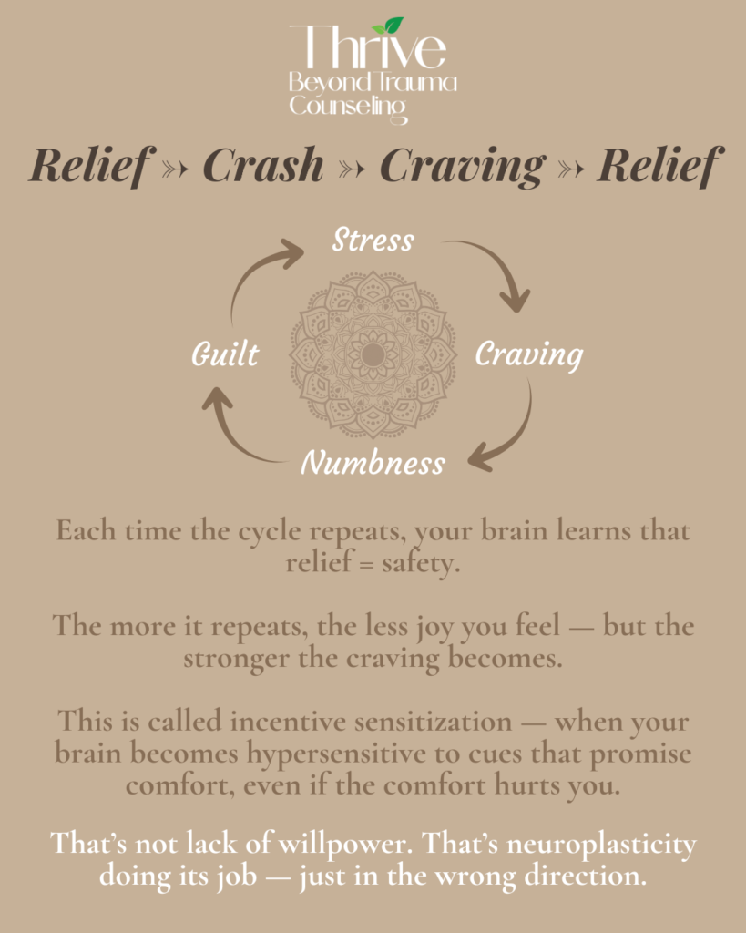 They’re not weak. Their nervous systems are trapped in a trauma-conditioned loop — overactivated stress circuits trying to soothe themselves with artificial calm.