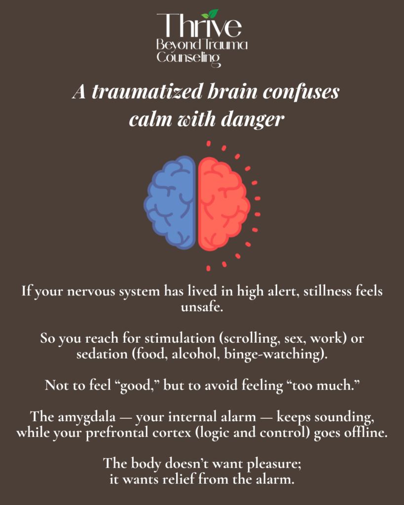 But for trauma survivors, the pain system becomes miscalibrated. Calm feels foreign. Stillness feels unsafe.