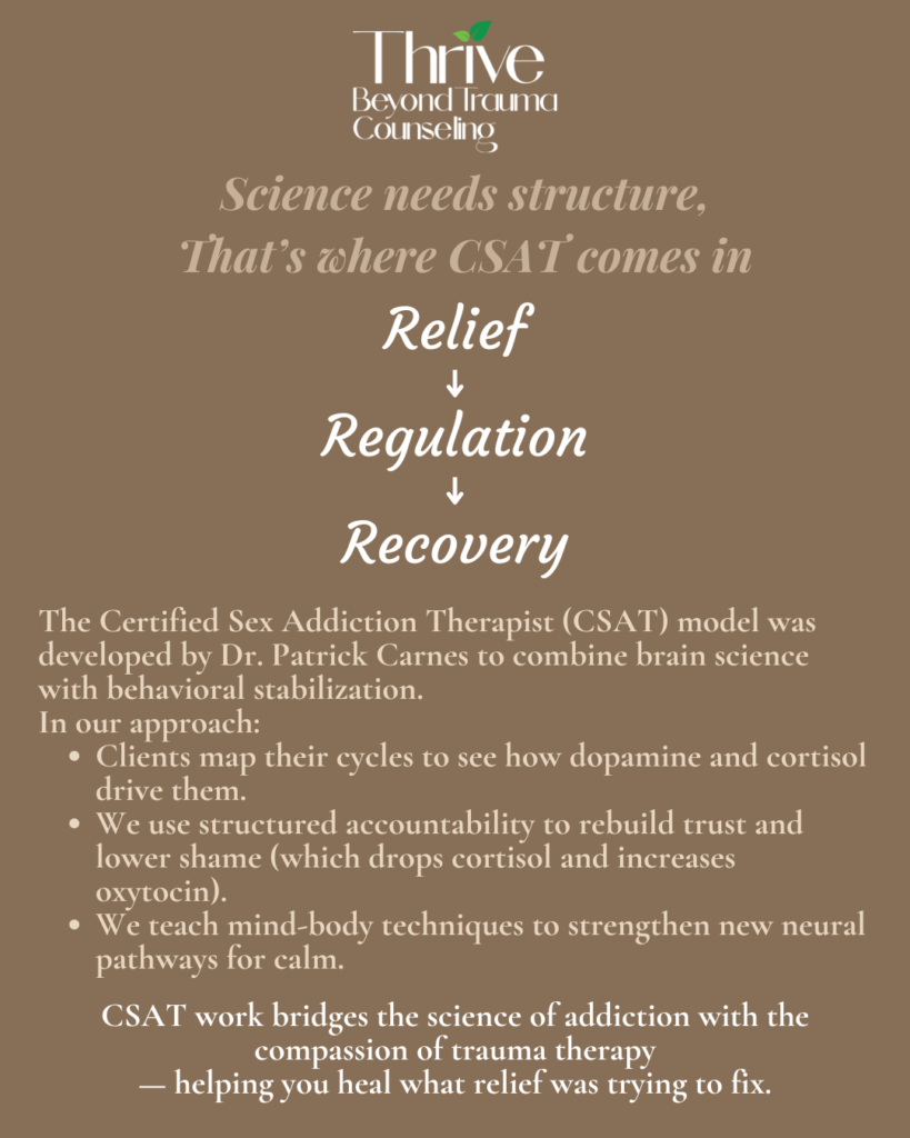 At Thrive Beyond Trauma Counseling, we integrate the science of the brain with the structure of the CSAT program and the compassion of mind-body therapies to create comprehensive healing for behavioral addiction and emotional dysregulation.